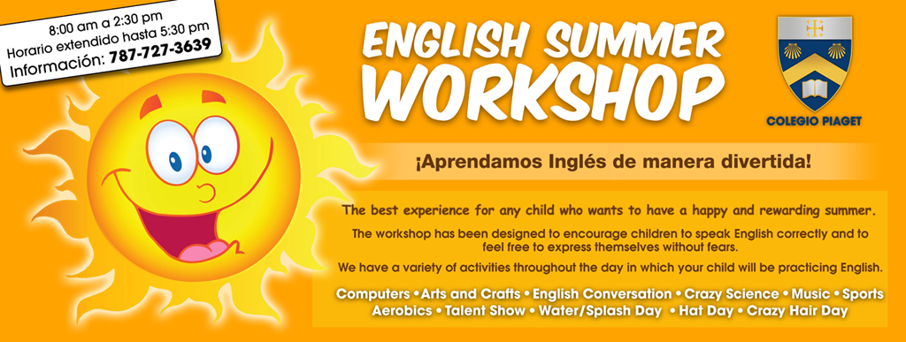 El Taller de Inglés del Colegio Piaget de Isla Verde es una excelente alternativa en el verano cuando se buscan nuevas formas creativas para mejorar las destrezas de este idioma de una forma entretenida. Bríndeles la oportunidad a sus hijos de experimentar la sensación de sentirse seguros de sí mismo, aprendiendo, compartiendo y divirtiéndose en un ambiente lleno de estímulos positivos para el aprendizaje. “Los niños son como espojas, aprenden sumamente rápido” comenta la Directora del Taller de Inglés, quien nos dice que el Colegio Piaget ha creado un programa diferente en el cual se combina la diversión con la enseñanza oral del inglés. Es un taller lleno de experiencias diferentes, de mucha alegría y mucho amor. Los resultados han sido fabulosos. Niños tímidos aprenden a vencer el miedo a hablar inglés, los que ya saben lo perfeccionan, todos sienten que de alguna manera están mejorando y perfeccionando sus destrezas orales del idioma. Los niños que participan en el taller de inglés se sienten importantes y felices. Es un mes intenso, educativo y sumamente divertido. Los niños podrán participar de un variado programa de actividades como: teatro, computadoras, bailes, música, yoga, juegos de mesa, dinámicas de inglés conversacional, baloncesto, volleyball, arte, manualidades, olimpiadas locas y experimentos de ciencia. Son días llenos de diversión donde no se dan cuenta que en realidad están practicando el inglés en todo momento. Los niños tienen la oportunidad no sólo de compartir y aprender, sino de desarrollar las destrezas del inglés conversacional, las cuales los ayudarán a tener éxito en el nuevo año escolar. El Taller se divide en grupos pequeños y por edades para niños y niñas de 4-12 años y el “Baby Workshop” para pequeñines de 2 a 3 años. El taller culmina con un tremendo “Talent Show” donde los padres podrán comprobar todo lo que han aprendido sus hijos/as durante este mes tan especial. Para más información llamar a los teléfonos: 787-664-4325 o 787-626-9330 o 787-727-3639 y 787-600-7760.